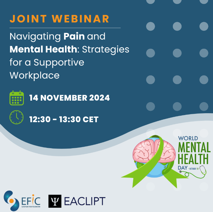 Register for this joint webinar organised by the European Pain Federation EFIC and the European Association of Clinical Psychology and Psychological Treatment (EACLIPT) on 14 November 2024 at 12.30pm CET. Don’t miss this opportunity to hear from experts in their field who will share the latest insights and research related to this year’s #WorldMentalHealthDay theme “Mental health at work”.