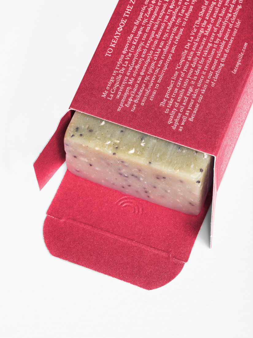 Το σαπούνι με έκκριμα σαλιγκαριού, ελαιόλαδο, άγρια λεβάντα, δενδρολίβανο και παπαρουνόσπορο απολεπίζει και αναζωογονεί το δέρμα. Το έκκριμα σαλιγκαριού βοηθά στην αποκατάσταση του επιδερμικού φραγμού του δέρματος και είναι πλούσιο σε κολλαγόνο διατηρώντας το δέρμα ενυδατωμένο. Το ελαιόλαδο είναι πλούσιο σε λιπαρά οξέα, βιταμίνη Ε και αντιοξειδωτικά, αναζωογονεί και ενυδατώνει το δέρμα καταπραΰνοντας τους ερεθισμούς. To έλαιο λεβάντας, το εκχύλισμα φύλλων δενδρολίβανου και το έλαιο κυπαρισσιού έχουν εξαιρετικές αντιμικροβιακές και αντιμυκητιακές ιδιότητες και συμβάλλουν στον καθαρισμό της επιδερμίδας. Το έλαιο πιπερόριζας έχει αντιμικροβιακές ιδιότητες και συμβάλλει στη ρύθμιση της λιπαρότητας του δέρματος. Ο παπαρουνόσπορος και το πίτουρο σιταριού απολεπίζουν απαλά το δέρμα χωρίς να προκαλούν ερεθισμούς. To έλαιο υλάνγκ υλάνγκ λειτουργεί αντιοξειδωτικά για την επιδερμίδα και παράλληλα η μυρωδιά του, έχει χαλαρωτική επίδραση στον οργανισμό.