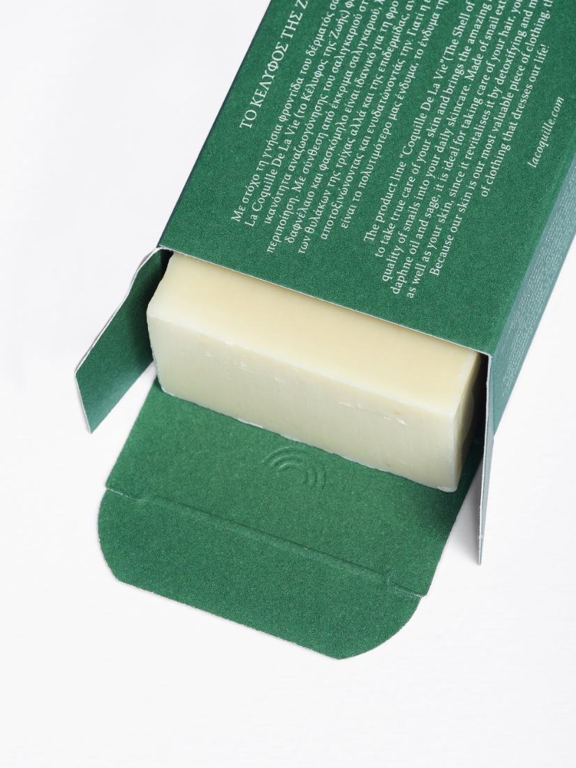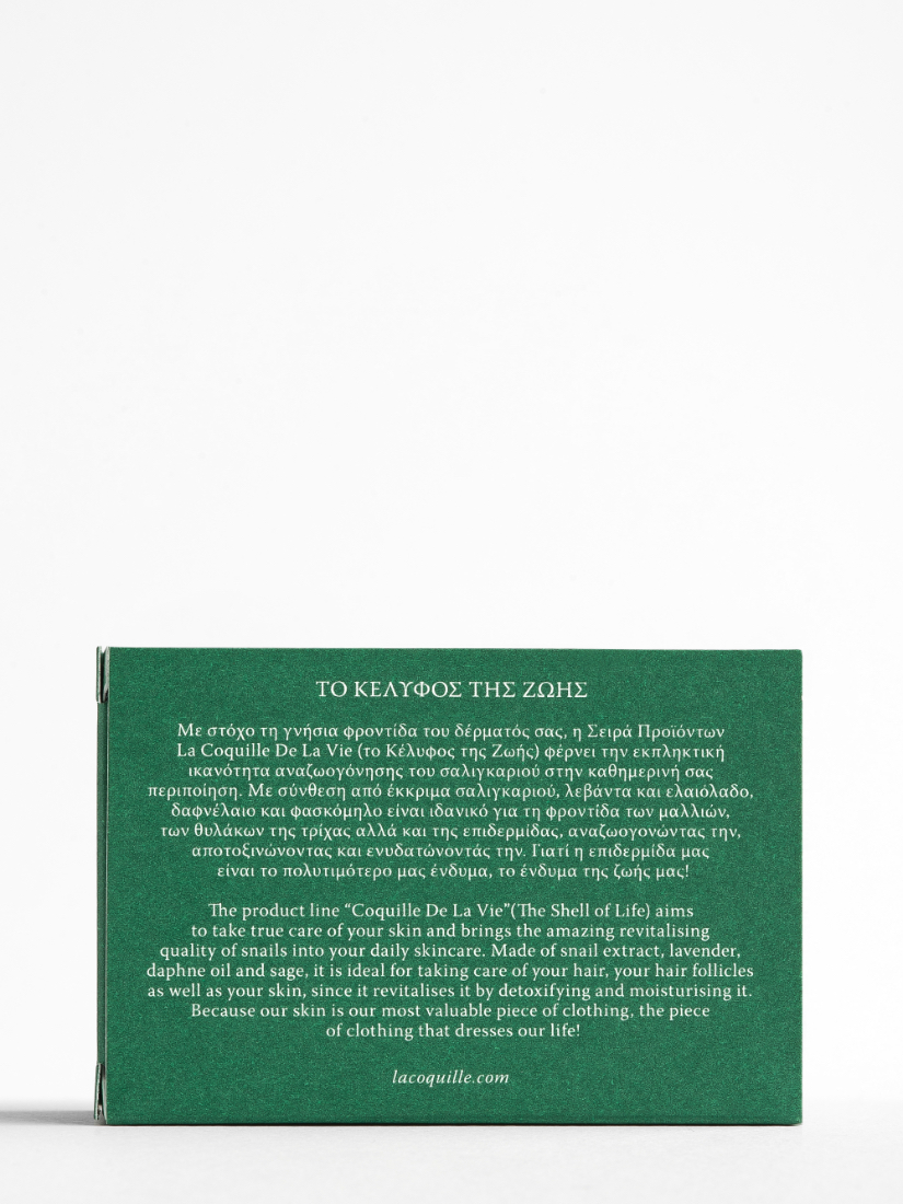 Το σαπούνι με έκκριμα σαλιγκαριού, ελαιόλαδο, δαφνέλαιο και φασκόμηλο καθαρίζει το δέρμα και ενδυναμώνει τα μαλλιά σε περιόδους εποχικής τριχόπτωσης. -Το έκκριμα σαλιγκαριού βοηθά στην αποκατάσταση του επιδερμικού φραγμού του δέρματος και είναι πλούσιο σε κολλαγόνο διατηρώντας το δέρμα ενυδατωμένο. -Το ελαιόλαδο και το αμυγδαλέλαιο είναι πλούσια σε λιπαρά οξέα, βιταμίνη Ε και αντιοξειδωτικά. Αναζωογονούν και ενυδατώνουν το δέρμα και τα μαλλιά. -To έλαιο λεβάντας και το εκχύλισμα φύλλων δενδρολίβανου έχουν εξαιρετικές αντιμικροβιακές και αντιμυκητιακές ιδιότητες και συμβάλλουν στον καθαρισμό της επιδερμίδας και στην ενδυνάμωση και ανάπτυξη των μαλλιών. -Το έλαιο φύλλων δάφνης δρα κατά της πιτυρίδας χάρη στις αντιμυκητιακές του ιδιότητες, αποτοξινώνει το τριχωτό της κεφαλής και αυξάνει την κυκλοφορία του αίματος προάγοντας την ανάπτυξη των μαλλιών. -Το έλαιο φασκόμηλου είναι ιδανικό για την αύξηση της πυκνότητας του τριχωτού καθώς βοηθά τα μαλλιά να διατηρηθούν λαμπερά και υγιή. -Το έλαιο πιπερόριζας προάγει την ανάπτυξη των μαλλιών αναστέλλοντας τη λειτουργία του ενζύμου 5α-ρεδουκτάση και ρυθμίζοντας την λιπαρότητα στο τριχωτό.