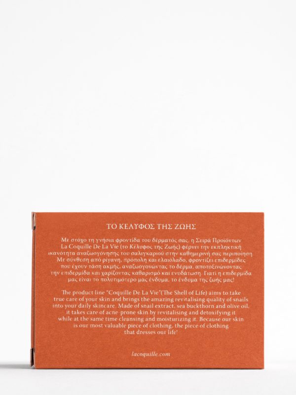Το σαπούνι με έκκριμα σαλιγκαριού, ελαιόλαδο, άγρια λεβάντα, ιπποφαές, ρίγανη και πρόπολη καθαρίζει αποτελεσματικά το δέρμα διατηρώντας το παράλληλα απαλό και ενυδατωμένο. -Το έκκριμα σαλιγκαριού βοηθά στην αποκατάσταση του επιδερμικού φραγμού του δέρματος και είναι πλούσιο σε κολλαγόνο διατηρώντας το δέρμα ενυδατωμένο. -Το ελαιόλαδο είναι πλούσιο σε λιπαρά οξέα, βιταμίνη Ε και αντιοξειδωτικά και μαζί με τους ενυδατικούς παράγοντες του ελαίου καρύδας αναζωογονούν και ενυδατώνουν το δέρμα. -Η πρόπολη έχει αντιφλεγμονώδεις ιδιότητες και βοηθά στην καταπράυνση της φλεγμονής που δημιουργείται στο δέρμα λόγω της ακμής. -To έλαιο λεβάντας έχει εξαιρετικές αντιμικροβιακές και αντιμυκητιακές ιδιότητες και σε συνδυασμό με τις αντιβακτηριακές ιδιότητες του ελαίου ρίγανης και την μυκητοκτόνο δράση του εκχυλίσματος μύρου εξουδετερώνουν τα μικρόβια που αναπτύσσονται από τις φλεγμονές της ακμής αποτρέποντας την εξάπλωσή της. -Το έλαιο ρίγανης λειτουργεί και αντιοξειδωτικά προστατεύοντας την επιδερμίδα. -Το έλαιο ταμανού με τις εξαιρετικές επουλωτικές, αντιβιοτικές και αντιφλεγμονώδεις ιδιότητές του, είναι ιδανικό για το ταλαιπωρημένο από την ακμή δέρμα. -Το φυτικό έλαιο ιπποφαές συμβάλλει στην εξισορρόπηση της επιδερμίδας και στη μείωση της υπερβολικής παραγωγής σμήγματος. -Το εκχύλισμα καλέντουλας έχει αντιμικροβιακή και αντιφλεγμονώδη δράση, καταπραΰνει τους ερεθισμούς και τη φλεγμονή και παράλληλα συμβάλλει στην εξουδετέρωση των ελευθέρων ριζών.